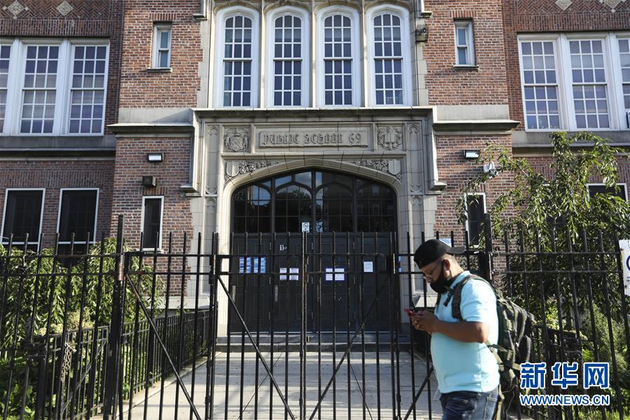 9月1日,行人从美国纽约一所公立学校外走过。 当天,纽约市长德布拉西奥宣布,纽约市公立学校系统原定9月10日的重开计划被推迟。 新华社记者 王迎 摄