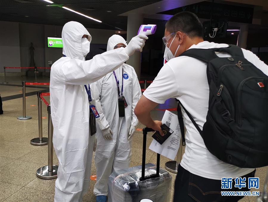 9月2日,在柬埔寨金边国际机场,身着防护服的中国国际航空公司工作人员为乘客测量体温。 由中国国际航空公司执飞的一个航班3日凌晨从柬埔寨金边国际机场起飞,已经飞抵北京。这是中国民航局决定自9月3日起逐步将经第一入境点分流的北京国际客运航班恢复直航之后的第一班。 新华社发(中国国际航空公司金边营业部供图)