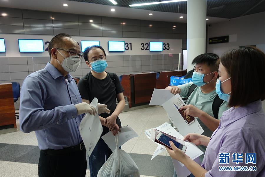9月2日,在柬埔寨金边国际机场,中国驻柬埔寨大使馆参赞兼总领事李杰(左一)与乘客交流。 由中国国际航空公司执飞的一个航班3日凌晨从柬埔寨金边国际机场起飞,已经飞抵北京。这是中国民航局决定自9月3日起逐步将经第一入境点分流的北京国际客运航班恢复直航之后的第一班。 新华社发(中国驻柬埔寨大使馆供图)