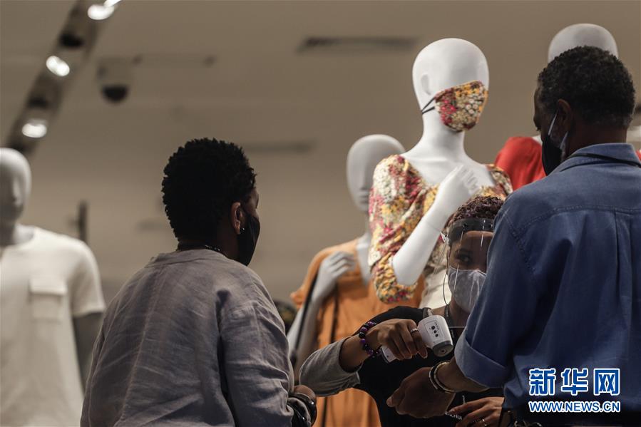 9月3日,巴西圣保罗一家服装店的店员给顾客测量体温。 根据巴西卫生部3日晚公布的最新数据,全国24小时内新增新冠确诊病例43773例,累计确诊病例4041638例。 新华社发(拉赫尔·帕特拉索 摄)
