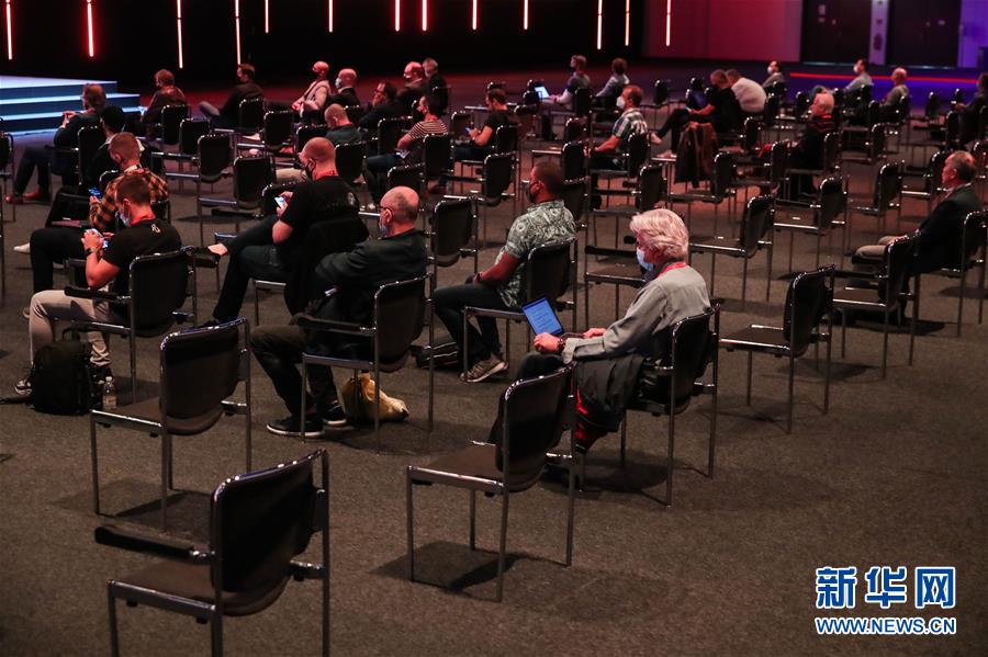 9月4日,在德国柏林举行的2020年柏林国际消费电子展上,一场发布会的参加者就座时保持间距。 2020年柏林国际消费电子展9月3日至5日在柏林举行。受新冠疫情影响,今年展会举办时间缩短至3天,并且仅对注册展商、交易商和媒体有限开放。同时在展馆内采取多种防疫措施确保展会安全进行。 新华社记者 单宇琦 摄