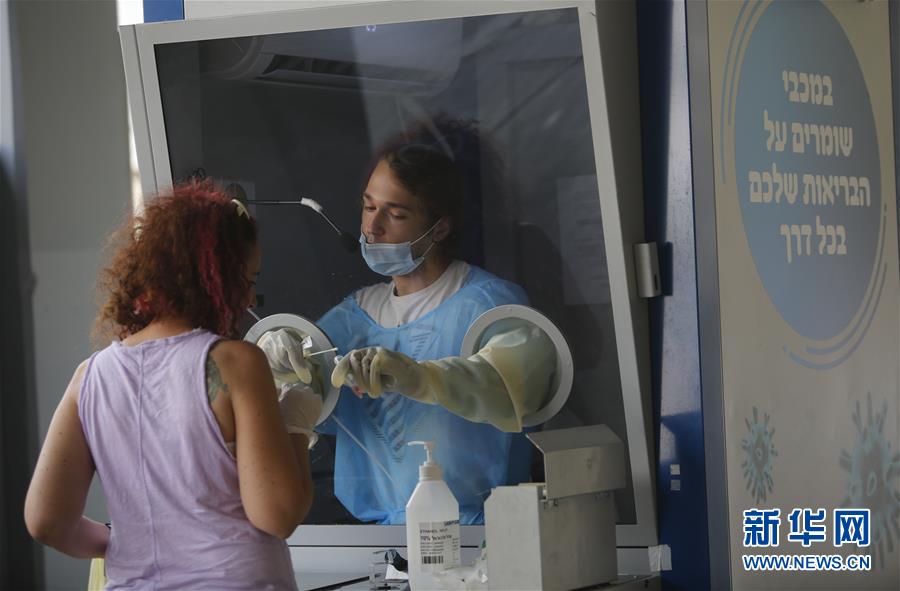 9月3日,在以色列中部城市霍隆的一处新冠病毒检测站,医务人员采集检测样本。 以色列卫生部3日报告新增确诊病例2991例,再创单日新增最高纪录。卫生部数据显示,截至当晚,累计确诊124455例,累计死亡985例。以色列政府决定于7日正式对一些疫情较严重的城市实施封锁。 新华社发(吉尔·科恩·马根摄)