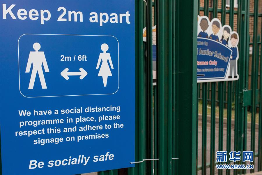 9月4日,英国伯克郡一所学校门口张贴的提示牌提醒人们保持安全距离。 近日,英国英格兰和威尔士地区的学校在新冠疫情下陆续开学。 新华社发(蒂姆·爱尔兰摄)