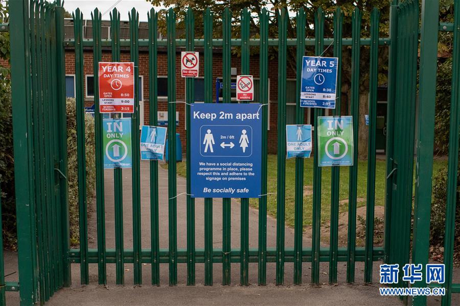 这是9月4日在英国伯克郡一所学校门口拍摄的不同年级上学时段以及提醒人们保持安全距离的提示牌。 近日,英国英格兰和威尔士地区的学校在新冠疫情下陆续开学。 新华社发(蒂姆·爱尔兰摄)