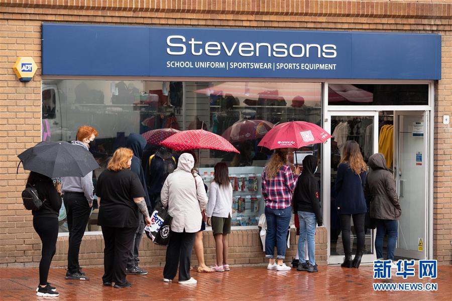 9月2日,人们在英国雷丁一家售卖校服的商店门口排队,为学生新学期开学做准备。 近日,英国英格兰和威尔士地区的学校在新冠疫情下陆续开学。 新华社发(蒂姆·爱尔兰摄)