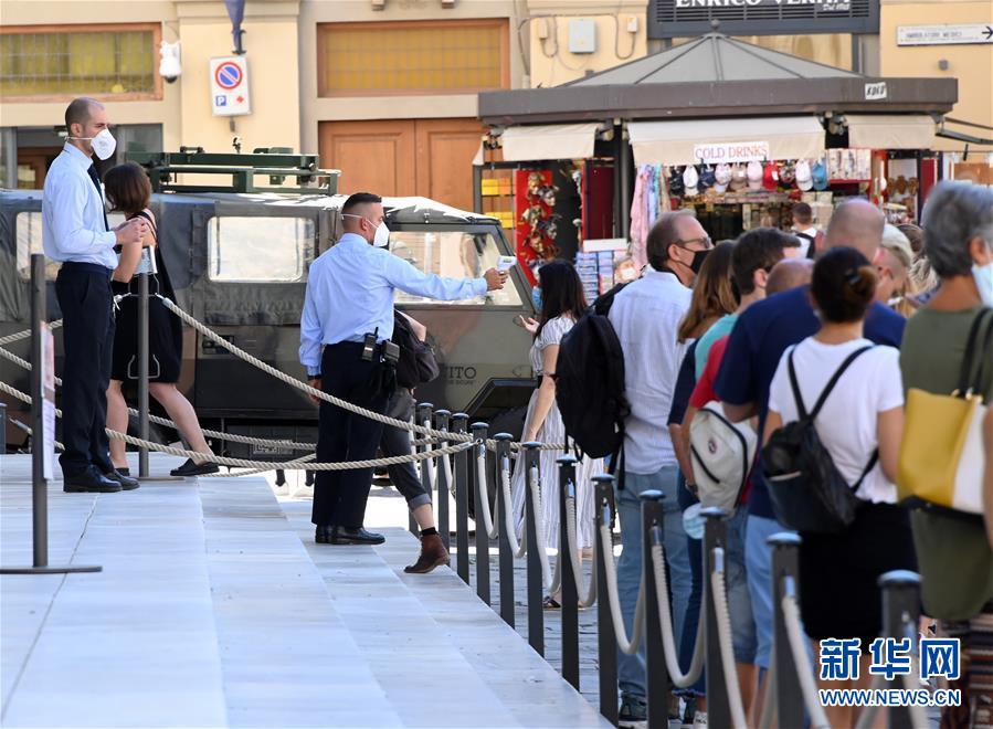 9月4日,在意大利佛罗伦萨,工作人员为排队进入圣母百花大教堂的游客测量体温。 近期意大利新冠病毒感染人数呈上升趋势。意大利卫生部4日公布的新冠疫情数据显示,该国当日新增确诊病例1733例,累计确诊达274644例。 新华社发(阿尔贝托·林格利亚摄)