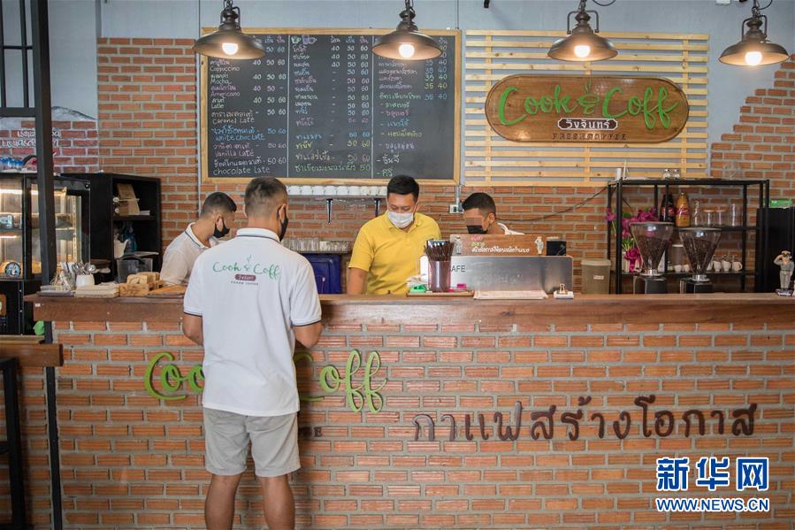9月2日,在泰国大城府“烹饪·咖啡”店内,因为狱中表现良好而被狱方选中的服务员在监狱教官(右二)的带领下准备咖啡。新华社记者 张可任 摄