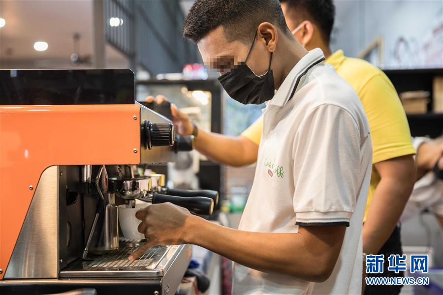 9月2日,在泰国大城府“烹饪·咖啡”店内,因为狱中表现良好而被狱方选中的服务员在监狱教官的带领下准备咖啡。新华社记者 张可任 摄