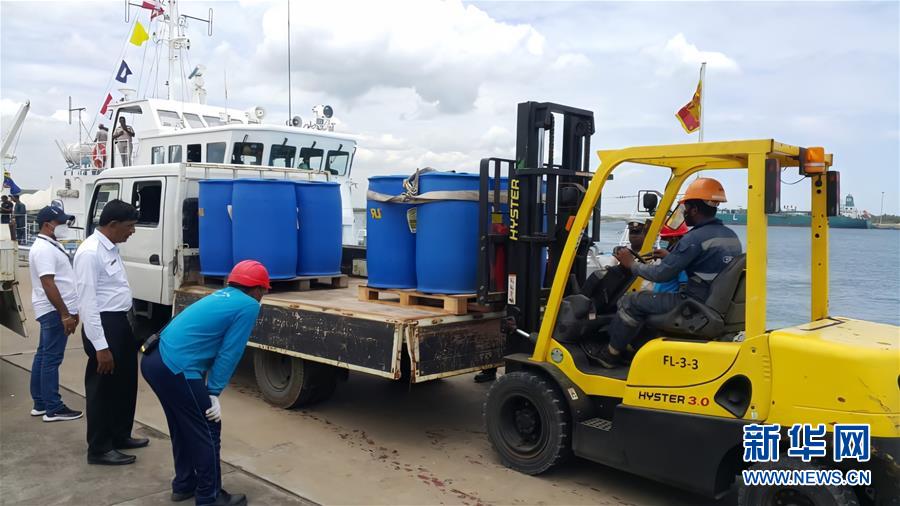 9月3日,在斯里兰卡南部城市汉班托塔,中斯合营的汉班托塔国际港口服务公司将专用灭火材料装上拖轮,准备前往救助起火的“新钻石”号油轮。 新华社发(汉班托塔国际港口服务公司供图)