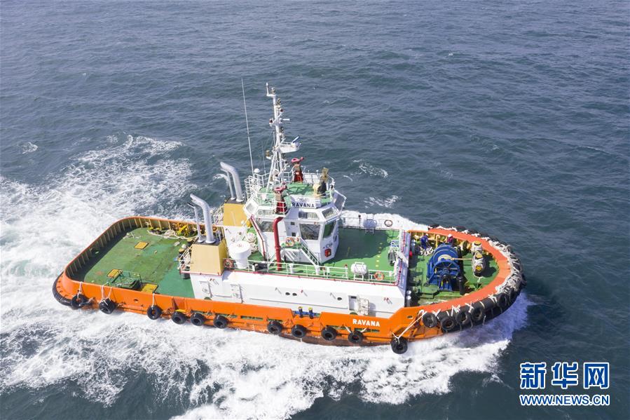9月3日,在斯里兰卡南部城市汉班托塔,中斯合营的汉班托塔国际港口服务公司派出的拖轮前往救助起火的“新钻石”号油轮(航拍照片)。新华社发(刘鸿儒摄)