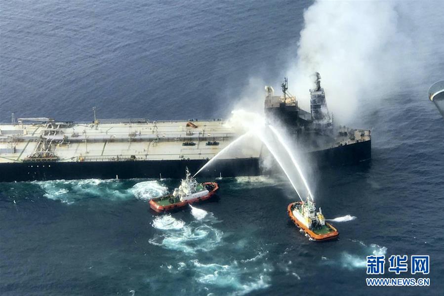 9月4日,在斯里兰卡以东海域,中斯合营的汉班托塔国际港口服务公司派出的拖轮为起火的“新钻石”号油轮灭火。 新华社发(斯里兰卡空军媒体处供图)