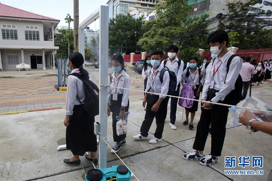 9月7日,柬埔寨金边一所高中的学生返校复课时走过消毒喷雾。 新华社发(索万纳拉摄)