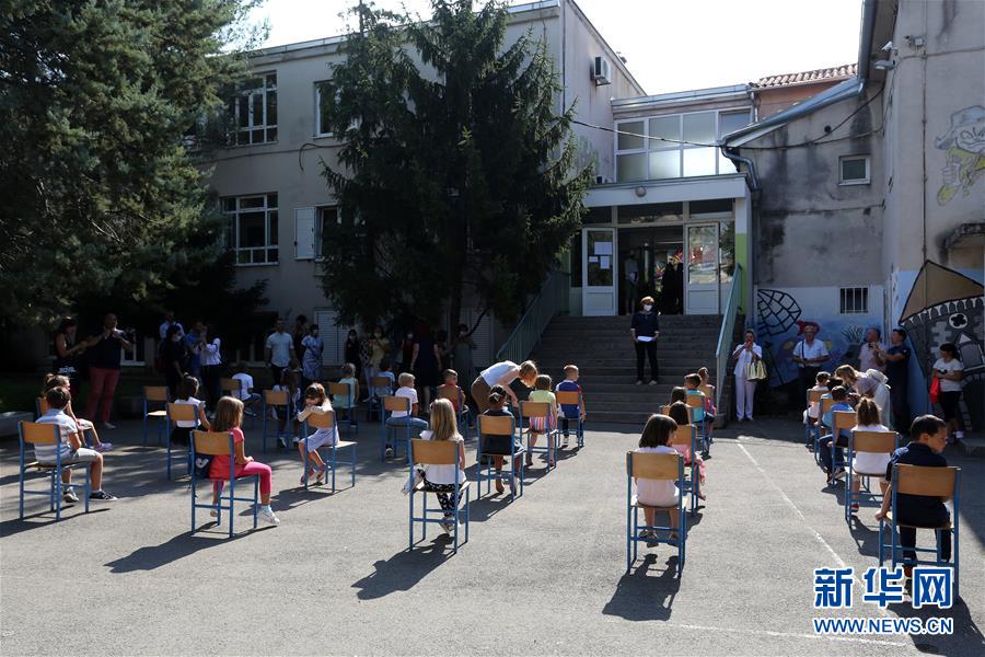 9月7日,克罗地亚里耶卡一所学校的学生们坐在操场上。 克罗地亚境内学校7日按政府要求正常开学,学校和师生均需遵守严格的新冠疫情防疫措施。 新华社发(科瓦契奇摄)