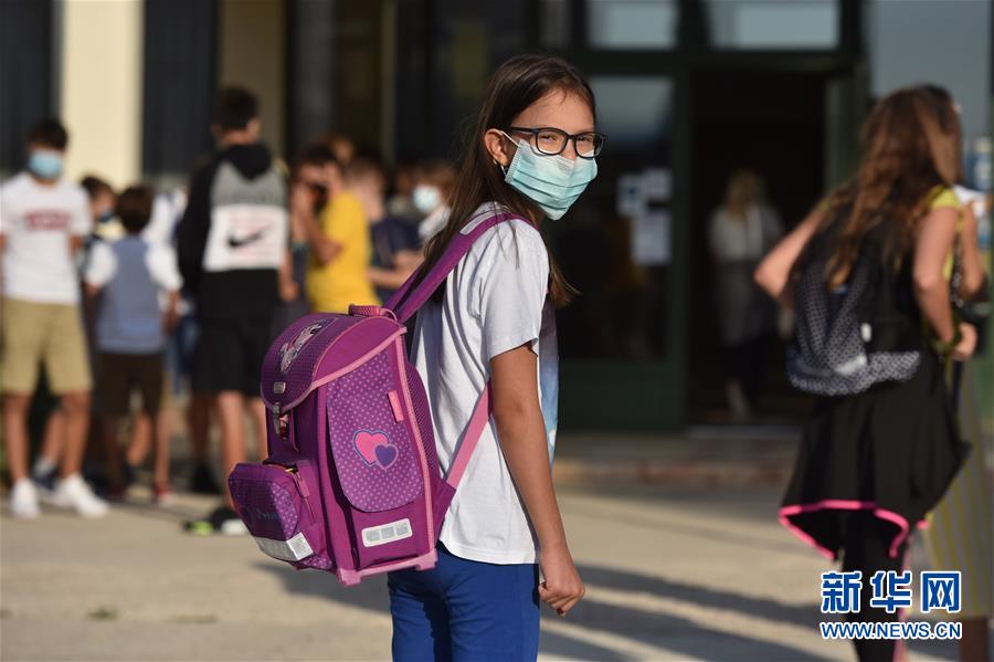 9月7日,在克罗地亚希贝尼克,一名戴口罩的学生到学校上课。 新华社发(耶拉维奇摄)