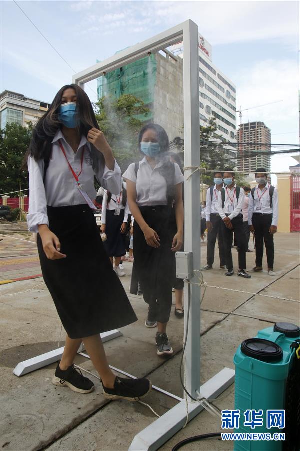 9月7日,柬埔寨金边一所高中的学生返校复课时走过消毒喷雾。新华社发(索万纳拉摄)