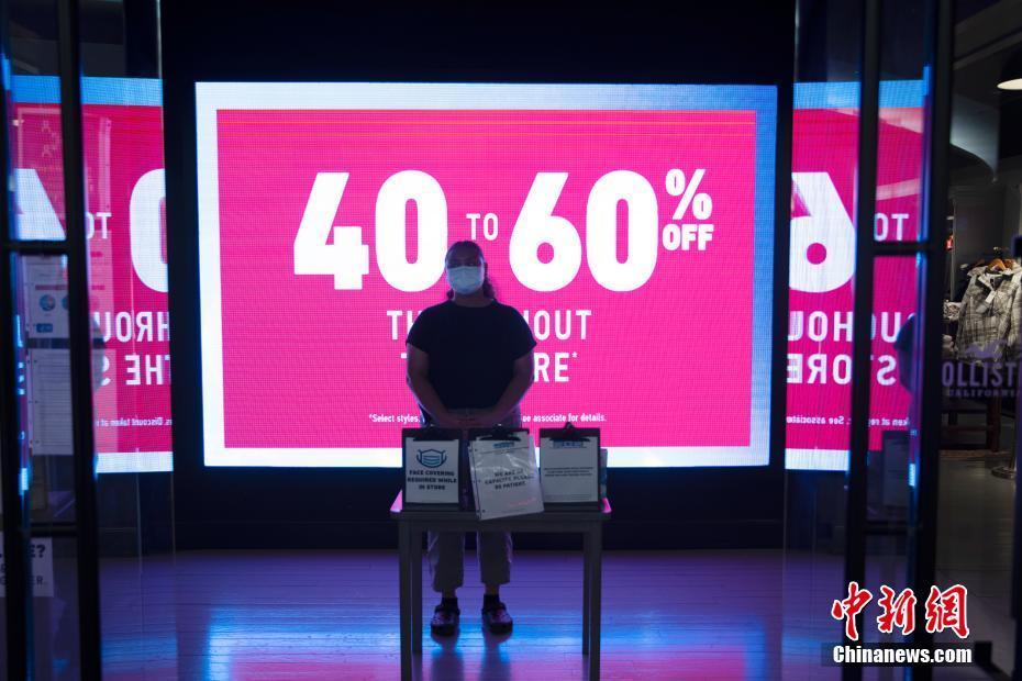 当地时间9月5日,美国加州旧金山知名的Westfield购物中心里,一家服装店的店员莎莉站在门口迎接顾客。她身后的电子屏上,打出全店40%-60%折扣的广告。近日,旧金山湾区各大商场及购物中心陆续重开室内购物。 中新社记者 刘关关 摄
