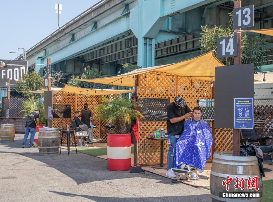 当地时间9月6日,美国旧金山理发师布赖斯(左)和同行们在户外为顾客理发。近日,旧金山理发、按摩和美甲等行业的从业者获准在户外为顾客提供服务。 中新社记者 刘关关 摄