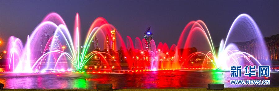 这是9月7日晚在科威特首都科威特城的沙希德公园拍摄的喷泉秀。 沙希德公园7日晚间举行了一场灯光喷泉秀。 新华社发(阿萨德摄)