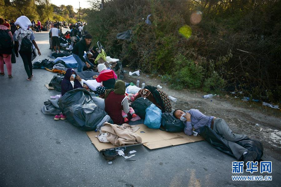9月9日,在希腊莱斯沃斯岛,发生火灾后逃离莫里亚难民营的难民和非法移民在路边休息。 据雅典-马其顿通讯社报道,位于莱斯沃斯岛的希腊最大难民营莫里亚难民营9日凌晨发生火灾,数以千计的难民和非法移民逃离,目前火势已得到控制,但尚无人员伤亡报告。 新华社发(帕纳吉奥提斯·帕拉斯卡斯摄)