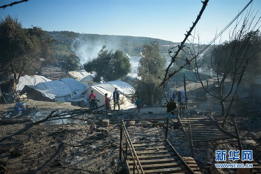 这是9月9日在希腊莱斯沃斯岛拍摄的火灾过后的莫里亚难民营。 据雅典-马其顿通讯社报道,位于莱斯沃斯岛的希腊最大难民营莫里亚难民营9日凌晨发生火灾,数以千计的难民和非法移民逃离,目前火势已得到控制,但尚无人员伤亡报告。 新华社发(帕纳吉奥提斯·帕拉斯卡斯摄)