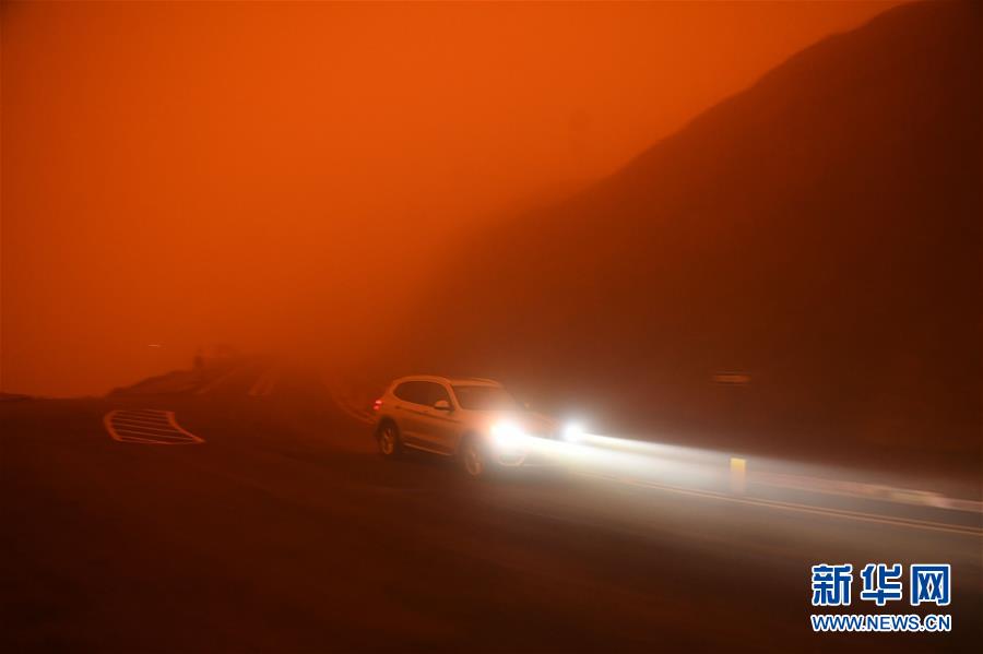 9月9日中午,一辆汽车行驶在美国加利福尼亚州旧金山金门大桥公园旁的公路上。 美国加利福尼亚州北部山火连日燃烧,形成的烟尘遮天蔽日。受其影响,9日正午时分,旧金山仍如夜晚般昏暗。 新华社记者 吴晓凌 摄