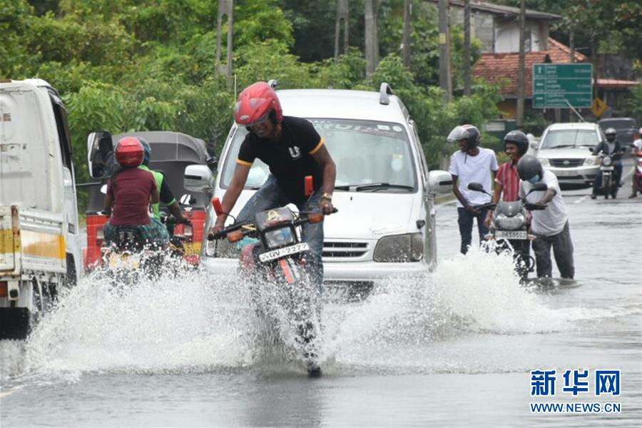 9月9日,在斯里兰卡加姆珀哈,人们驱车涉水前行。 南亚季风雨季从每年6月持续至9月,雷电暴雨天气频发。 新华社发(加扬·萨米拉摄)
