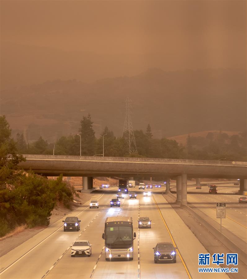 9月9日午后拍摄的照片显示,美国加州硅谷地区的天空被烟尘笼罩,位于苹果公司总部附近的280高速公路,行驶的车辆打开照明灯。 美国加州北部山火连日燃烧形成的烟尘遮天蔽日。受其影响,9日白天,旧金山湾区如夜晚般昏暗。 新华社发(董旭东摄)