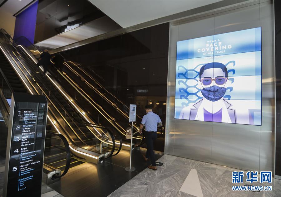 9月9日,在美国纽约的哈德逊广场购物中心,电子屏提示顾客佩戴口罩。 当天,纽约市的购物中心被允许重新开放。 新华社记者 王迎 摄