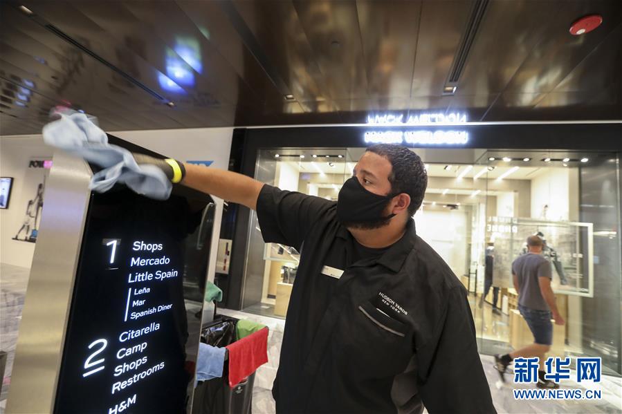 9月9日,清洁工在美国纽约的哈德逊广场购物中心工作。 当天,纽约市的购物中心被允许重新开放。 新华社记者 王迎 摄