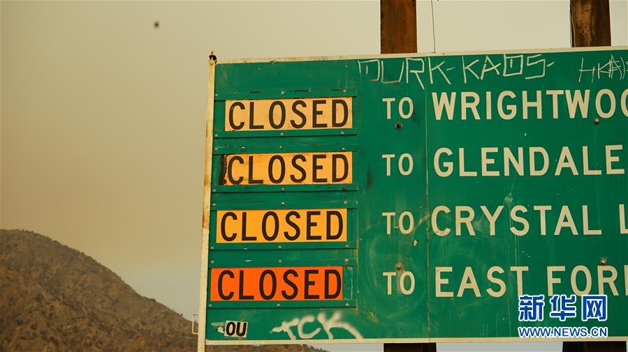 9月9日,在美国加利福尼亚州阿祖萨,山火区域附近的道路被封闭。 加州山火连日燃烧形成的烟尘遮天蔽日。 新华社发(曾慧摄)