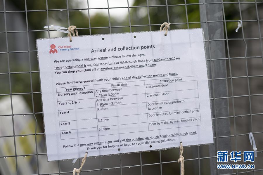 这是9月8日在英国大曼彻斯特地区拍摄的一所小学外张贴的分时段上学提示牌。 英国各地近期陆续开学以来,每日新增感染病例数迅速上升,多所学校出现小规模集中感染。为遏制疫情蔓延,大曼彻斯特地区实行更加严格的防疫措施。 新华社发(乔恩·休珀摄)