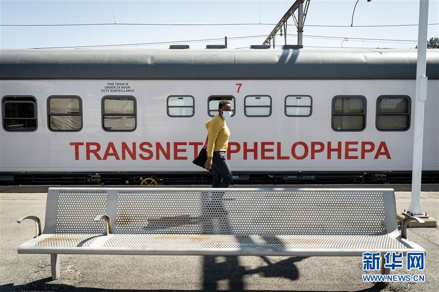 9月10日,在南非约翰内斯堡,一名市民从流动火车车厢医疗站前走过。