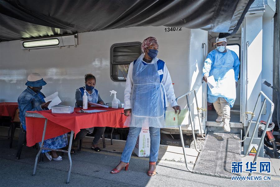 9月10日,医护人员在南非约翰内斯堡的流动火车车厢医疗站入口处等待就诊的市民。新华社发(耶希尔摄)