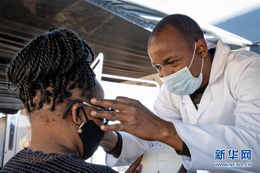 9月10日,在南非约翰内斯堡的流动火车车厢医疗站内,一名医生为患者检查视力。新华社发(耶希尔摄)