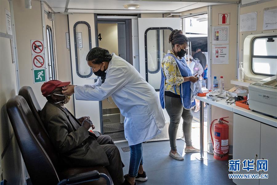 9月10日,在南非约翰内斯堡的流动火车车厢医疗站内,一名医生为患者检查视力。新华社发(耶希尔摄)