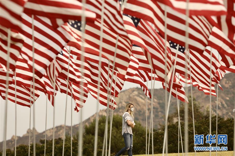 9月11日,在美国加利福尼亚州马利布,一名戴口罩的女子从佩珀代恩大学草坪上的“旗海”旁走过。受新冠疫情影响,今年佩珀代恩大学为纪念“9·11”事件19周年设立的“旗海”不对公众开放。 当日是美国“9·11”事件19周年纪念日。 新华社发