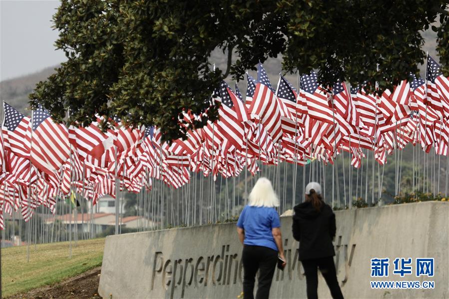 9月11日,在美国加利福尼亚州马利布,人们驻足观看佩珀代恩大学草坪上的“旗海”。受新冠疫情影响,今年佩珀代恩大学为纪念“9·11”事件19周年设立的“旗海”不对公众开放。 当日是美国“9·11”事件19周年纪念日。 新华社发