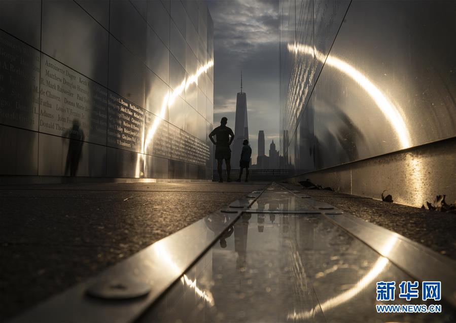 9月11日,在美国新泽西州泽西城的自由州立公园,人们查看镌刻在“空旷的天空”纪念碑上的“9·11”罹难者姓名。 当日是美国“9·11”事件19周年纪念日。 新华社记者王迎摄
