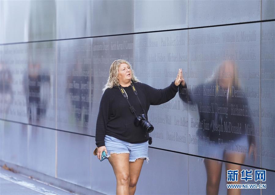 9月11日,在美国新泽西州泽西城的自由州立公园,一名女子抚摸镌刻在“空旷的天空”纪念碑上的“9·11”罹难者姓名。 当日是美国“9·11”事件19周年纪念日。 新华社记者王迎摄