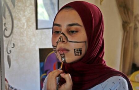 18岁巴勒斯坦女艺术家在脸上画口罩