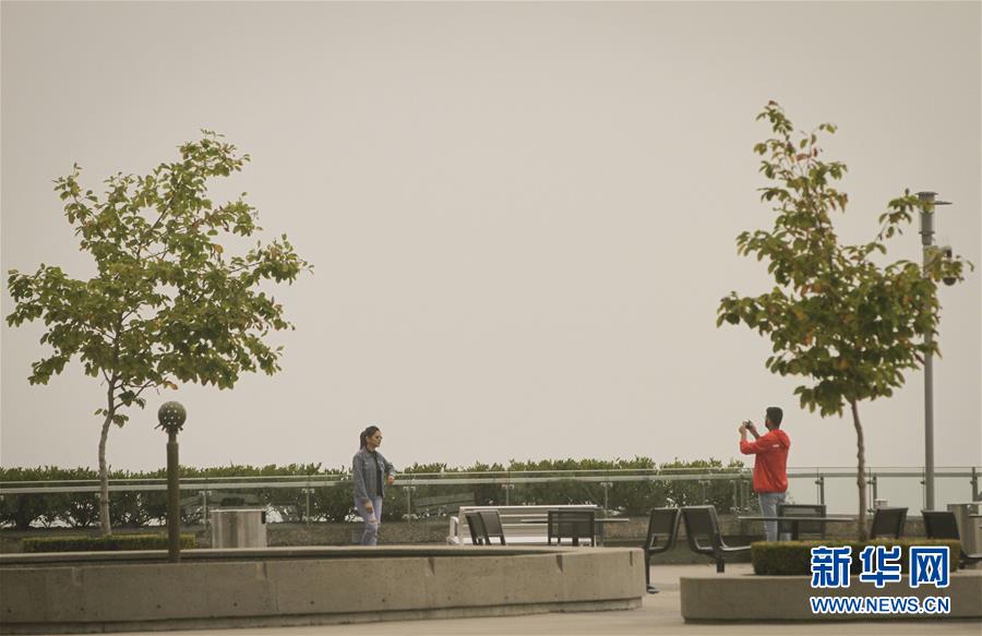 9月13日,在加拿大温哥华,人们在雾霾中拍照。当日,由于美国山火产生的烟尘向北扩散至加拿大西岸地区,温哥华空气污染状况持续,成为全球空气质量最差的城市之一。新华社发(梁森摄)