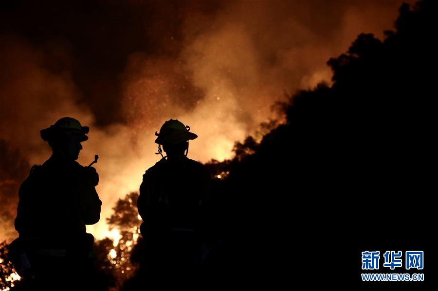 9月13日晚,消防员在美国阿卡迪亚附近的山区参与灭火行动。 由于山火肆虐,9月13日,邻近火场的美国洛杉矶县阿卡迪亚市等地的部分居民被要求撤离家园。 新华社发