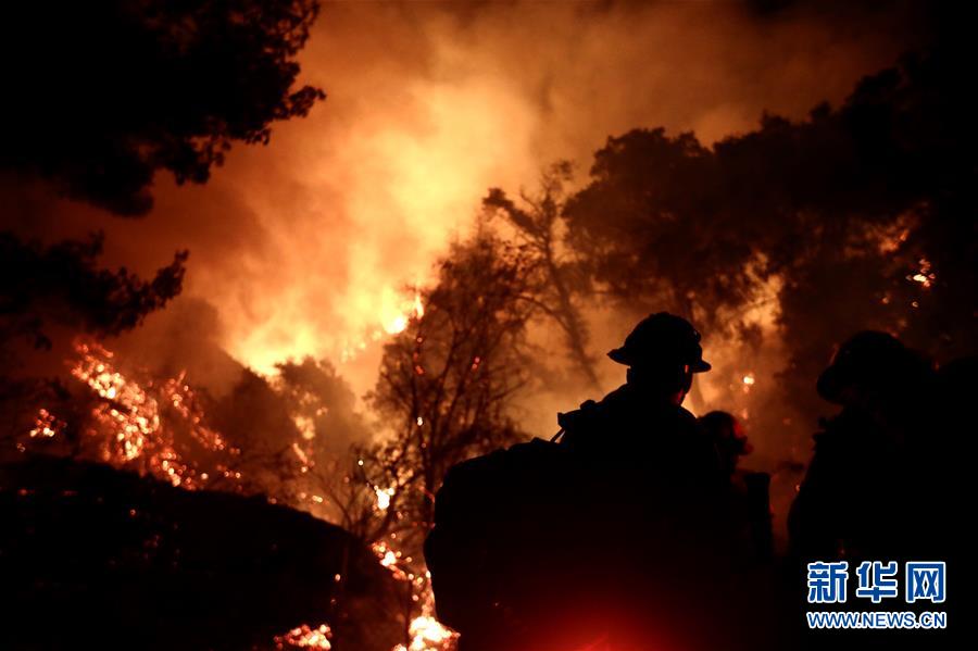 9月13日晚,消防员在美国阿卡迪亚附近的山区参与灭火行动。 由于山火肆虐,9月13日,邻近火场的美国洛杉矶县阿卡迪亚市等地的部分居民被要求撤离家园。 新华社发
