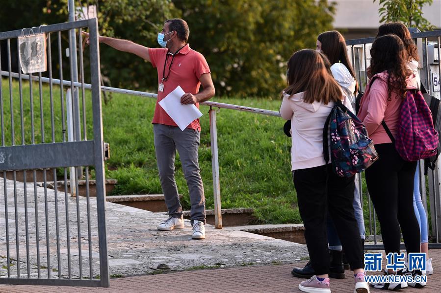 9月14日,意大利贝加莫省南布罗一所高中的学生等待进入校园。 意大利数百万中小学生14日结束六个月的居家防疫生活,回到校园上学。除意大利北部一些地区的学校已率先重新开放外,意大利大约800万中小学生中的大部分于14日返校复课。 新华社发(米凯莱·马拉维利亚摄)