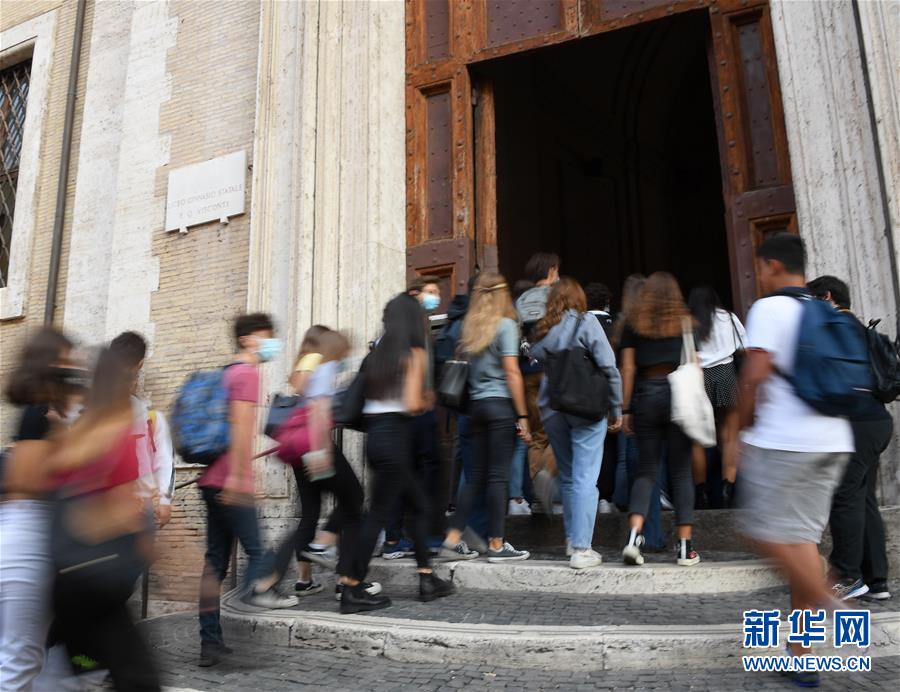 9月14日,在意大利首都罗马,维斯孔蒂高中的学生走进学校。 意大利数百万中小学生14日结束六个月的居家防疫生活,回到校园上学。除意大利北部一些地区的学校已率先重新开放外,意大利大约800万中小学生中的大部分于14日返校复课。 新华社发(埃莉萨·林格利亚摄)