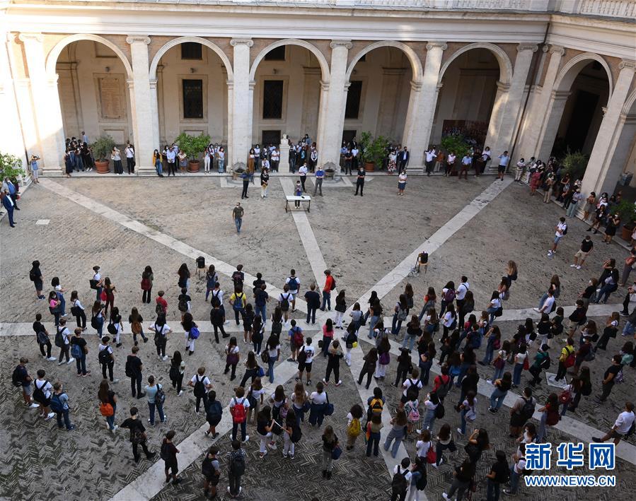 9月14日,在意大利首都罗马,维斯孔蒂高中的新生聆听校长致欢迎辞。 意大利数百万中小学生14日结束六个月的居家防疫生活,回到校园上学。除意大利北部一些地区的学校已率先重新开放外,意大利大约800万中小学生中的大部分于14日返校复课。 新华社发(埃莉萨·林格利亚摄)