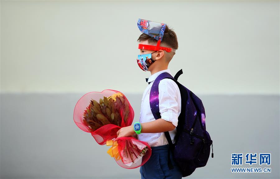 9月14日,在阿尔巴尼亚首都地拉那一所学校,一名学生带着花束返校上课。 当日,阿尔巴尼亚中小学2020-2021学年开学,学生们返校上课。 新华社发(阿尔本·切利 摄)