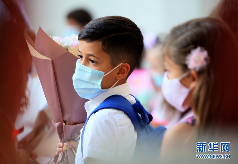 9月14日,在阿尔巴尼亚首都地拉那一所学校,一名学生带着花束返校上课。 当日,阿尔巴尼亚中小学2020-2021学年开学,学生们返校上课。 新华社发(阿尔本·切利 摄)