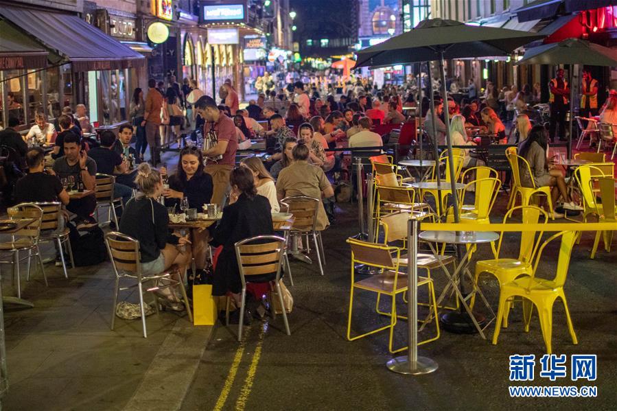 9月14日,人们在英国伦敦SOHO区一处临时占道改造成的户外餐区就餐。 根据英国首相约翰逊宣布的疫情防控新举措,自9月14日起,除少数情况外,日常社交场合中的聚集人数不得超过6人,室内室外均适用,违者可能面临罚款等处罚。不过,学校和工作场合等并不受影响。 新华社发(蒂姆·爱尔兰摄)