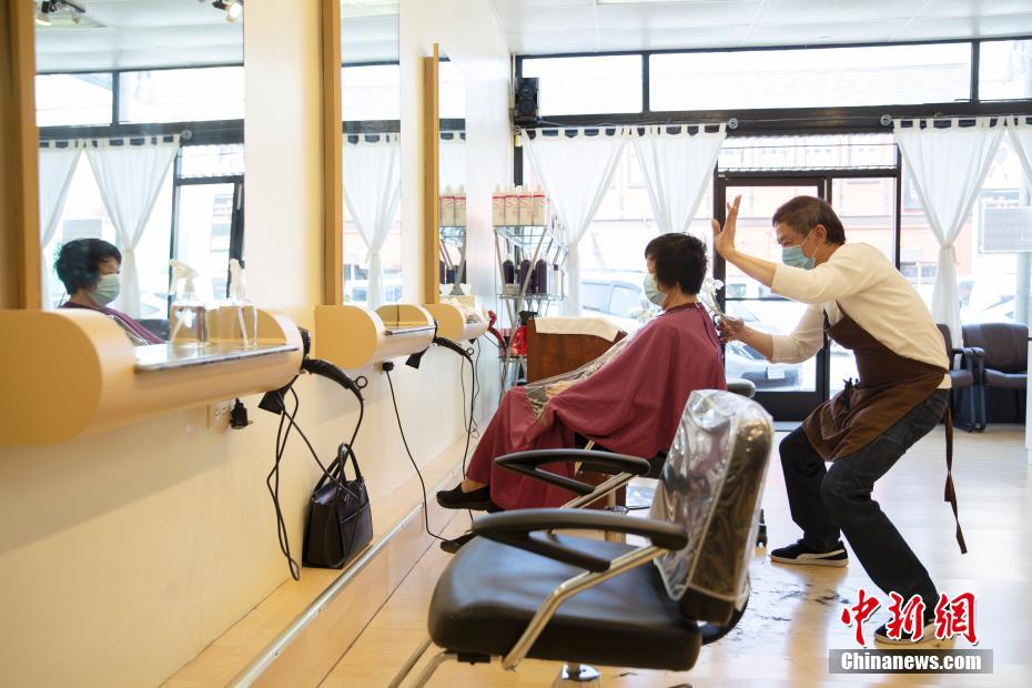当地时间9月15日,顾客在美国旧金山一家理发店内理发。从14日开始,旧金山的理发店、美甲店、健身房以及酒店等商业店铺获准重启室内营业。中新社记者 刘关关 摄